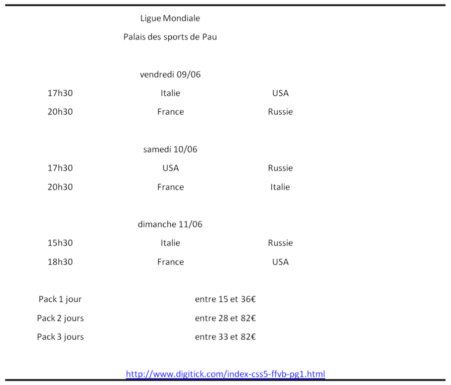 Afin de participer à cette compétition inoubliable, en club, en équipe, en famille, ou entre amis, le Comité Départemental de Volley-Ball des Pyrénées-Atlantiques organise des préventes de billets (attention places limitées).